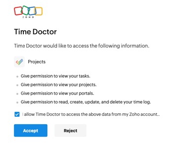 - After accepting access user will be redirected to Time Doctor Zoho Integration Details